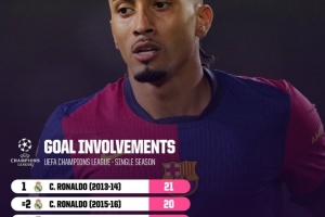 OPTA也盘点了单赛季欧冠参与进球榜,其中本赛季拉菲尼亚已经可以排在并列第4位,具体如下: